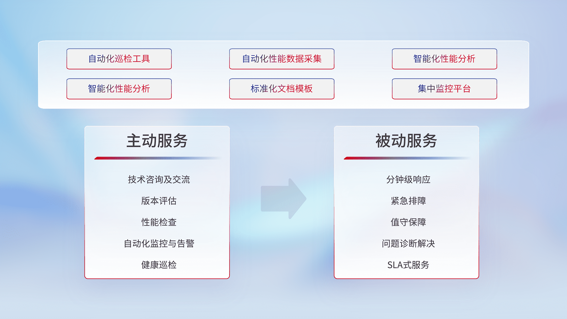 智能化工具和标准化文档,,保障服务质量,,提供主动服务(包含技术咨询、、、、版本评估、、性能检查、、、、自动化监控与告警、、健康巡检)和被动服务包含(分钟级响应、、紧急排障、、值守保障、、、、问题诊断解决、、、SLA服务)。。。